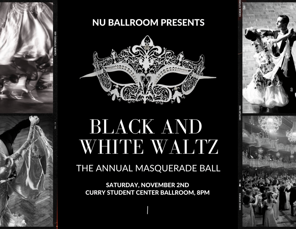 For our last event of the semester, NUBDC presents the Annual Masquerade Ball! Dress in your fancy/formal wear, grab one of our masquerade masks (while supplies last), and waltz the night away! The event will start with a beginner international waltz lesson at 8:00 PM (no experience necessary) and continue with open floor and social dance time. Join us in the Curry Student Center Ballroom and enjoy this final dance event in 2024!