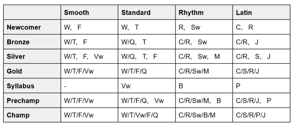 - Competitors may only span two levels of events across registration. E.g., a competitor may dance Gold Latin and Silver Standard, but not Gold Latin, Silver Standard, and Prechamp Rhythm.